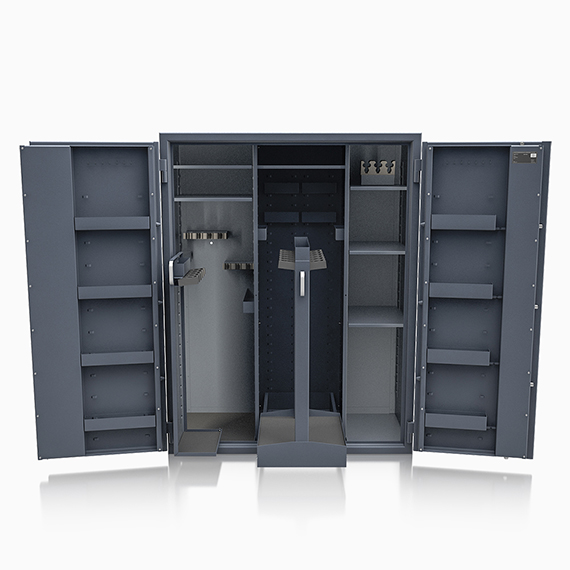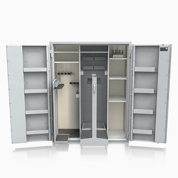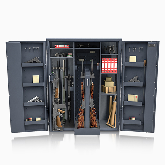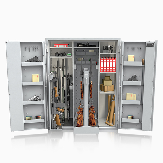 Duża dwudrzwiowa szafa na broń z oświetleniem LED wyposażona w 27 przestawnych uchwytów piankowych. W tylnej części znajdują się uchwyty magnetyczne 55 mm: 2×3 uchwyty i 1×4 uchwyty. Na ruchomej ściance na szynie znajduje się 5 uchwytów 55 mm, a na wysuwanym cargo są dwie szyny po 6 uchwytów 65 mm. W szafie jest także 6 przestawnych półek, po 4 pojemniki na każdych drzwiach, 9 pojemników do zawieszania a także 14 haczyków na drzwiach (po 7 na każdych) na klucze i akcesoria.