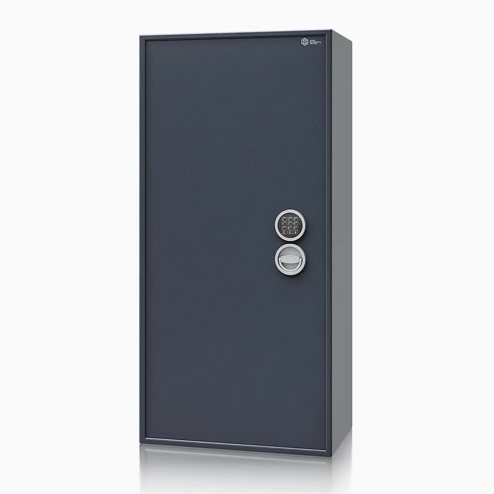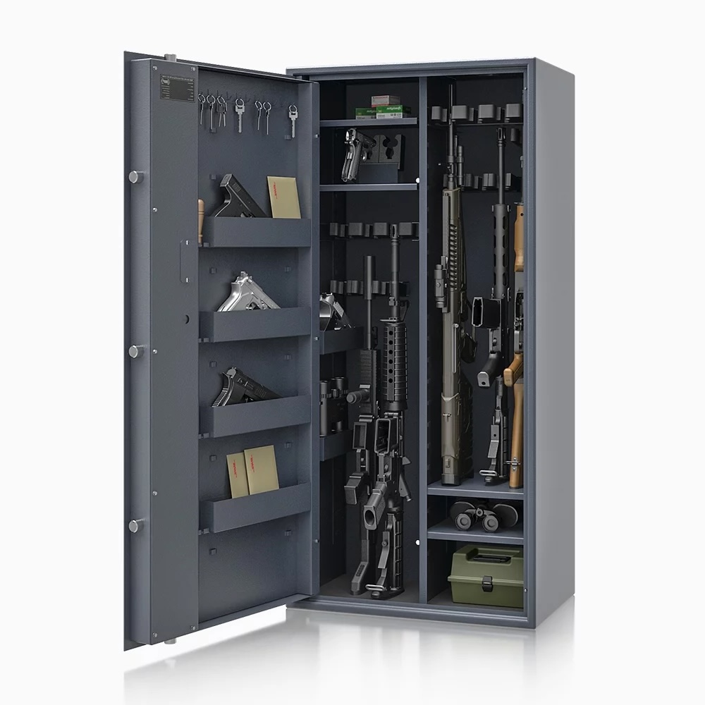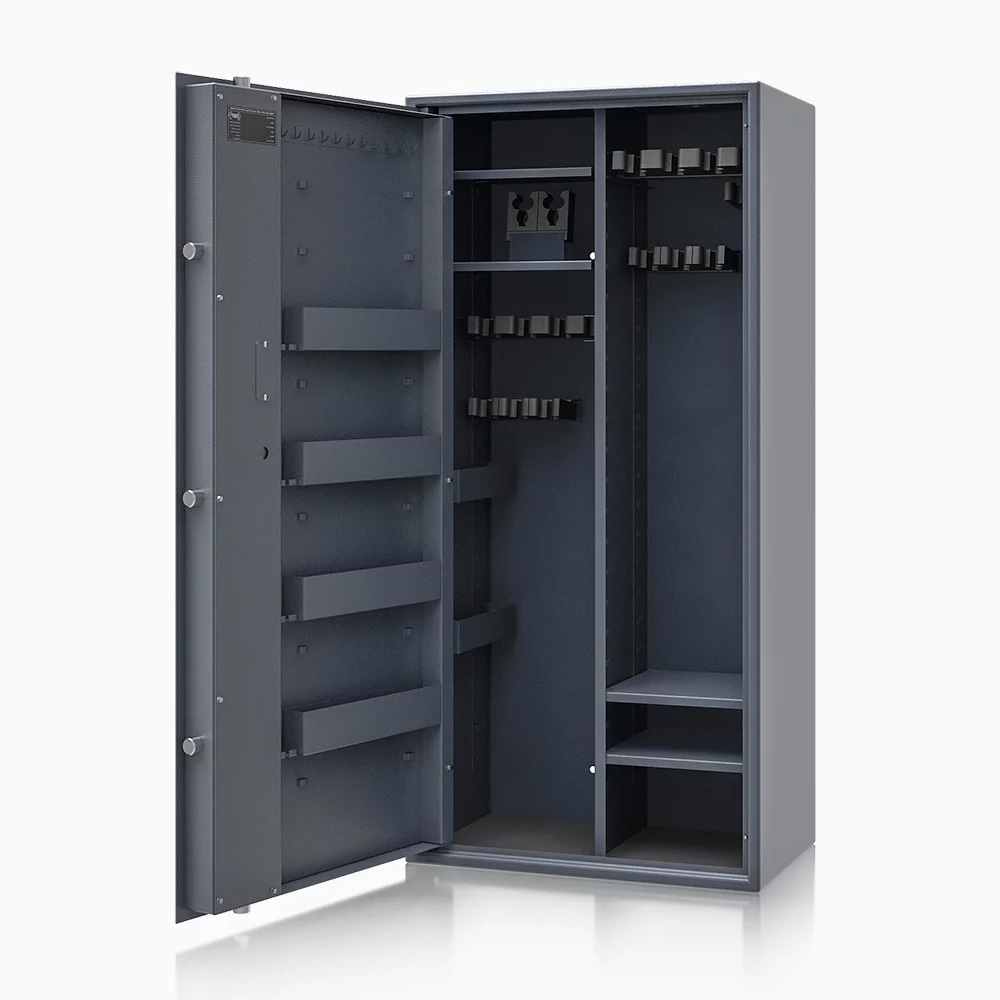 Szafa na broń z drzwiami otwieranymi w Lewo. Wyposażona w aż 18 przestawnych uchwytów: 8 uchwytów na przestawnych szynach, 2 listwy magnetyczne z dwoma uchwytami oraz 2 listwy magnetyczne z trzema uchwytami. Dodatkowo są 4 przestawne półki wewnętrz szafy, 4 półki na drzwiach, 2 pojemniki do zawieszania a także 11 haczyków na klucze i akcesoria.