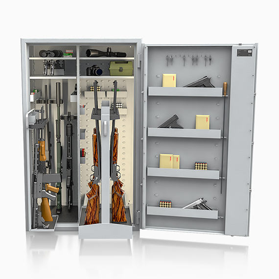 Dzięki w pełni przestawnym półkom i uchwytom a nawet przestawnym pojemnikom na drzwiach wnętrze szafy może być całkowicie spersonalizowane pod swoje potrzeby. Dzięki takiemu rozwiązaniu mamy możliwość przechowywania broni krótkiej oraz długiej o różnej wysokości. Perforacja na ścianach szafy pozwala na stworzenie indywidualnej organizacji przechowywanym przedmiotom.