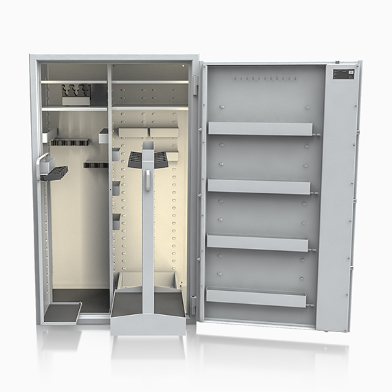 Dla jeszcze większej wygody szafy wyposażone są w ruchome ścianki oraz wysuwane cargo dzięki czemu otrzymujemy lepszy dostęp do deponowanej broni. Wysuwane cargo umożliwia przechowywanie broni z lunetą a jego wysunięcie odsłania „tajny” schowek w podłodze.