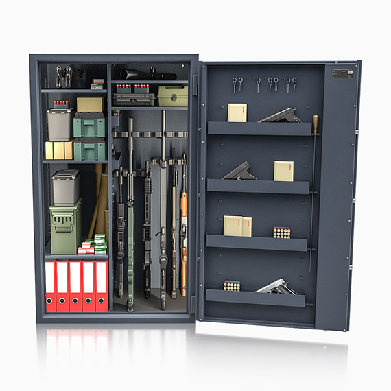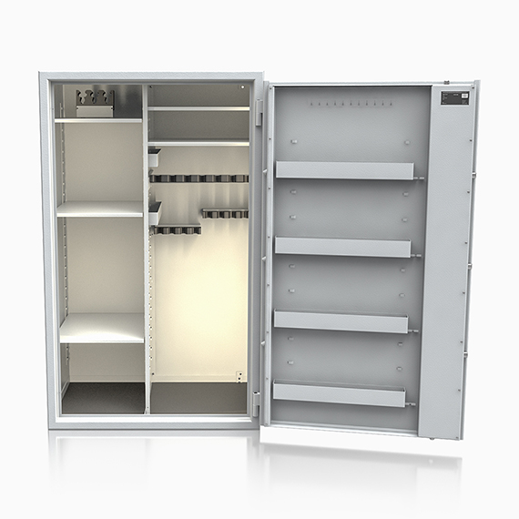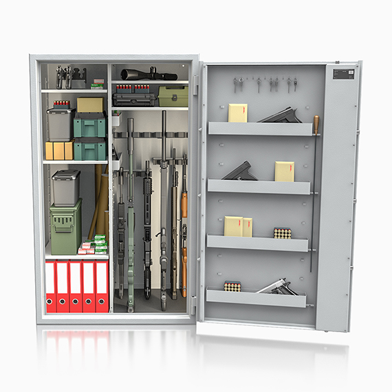 Dzięki w pełni przestawnym półkom i uchwytom a nawet przestawnym pojemnikom na drzwiach wnętrze szafy może być całkowicie spersonalizowane pod swoje potrzeby. Dzięki takiemu rozwiązaniu mamy możliwość przechowywania broni krótkiej oraz długiej o różnej wysokości. Perforacja na ścianach szafy pozwala na stworzenie indywidualnej organizacji przechowywanym przedmiotom.